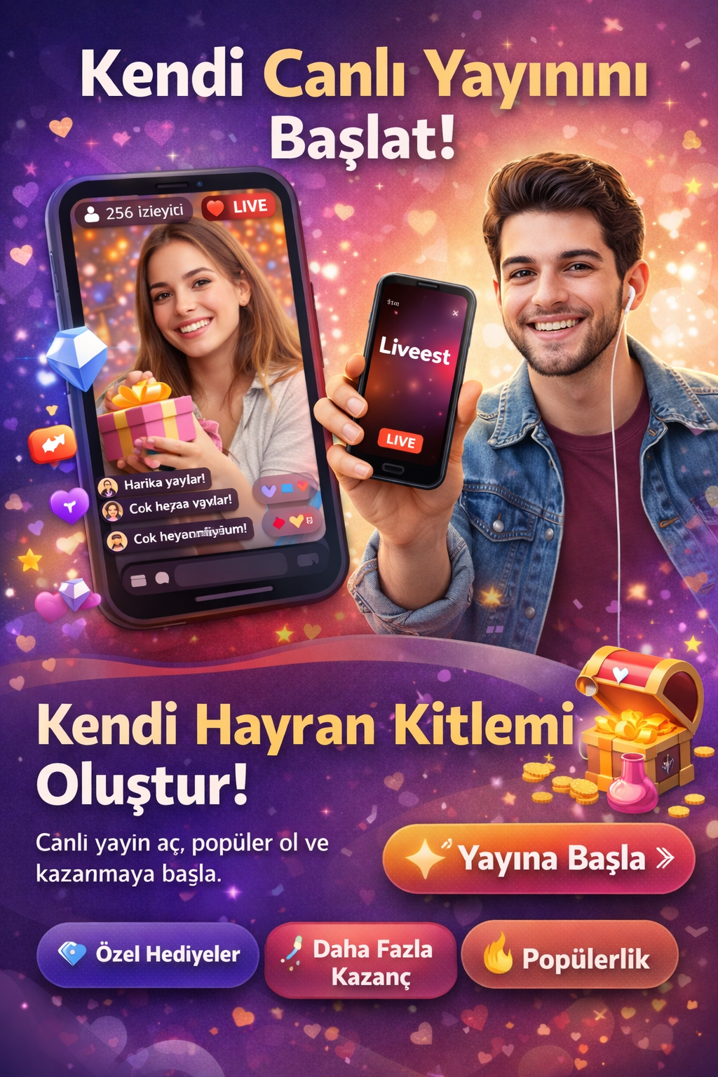 Canlı yayın aç, insanlarla anında bağlantı kur, keşfet ve kazanmaya başla!